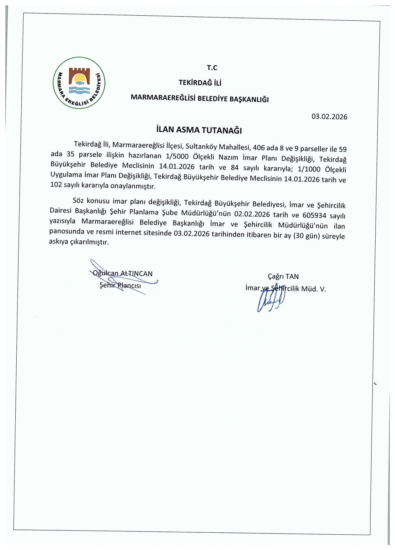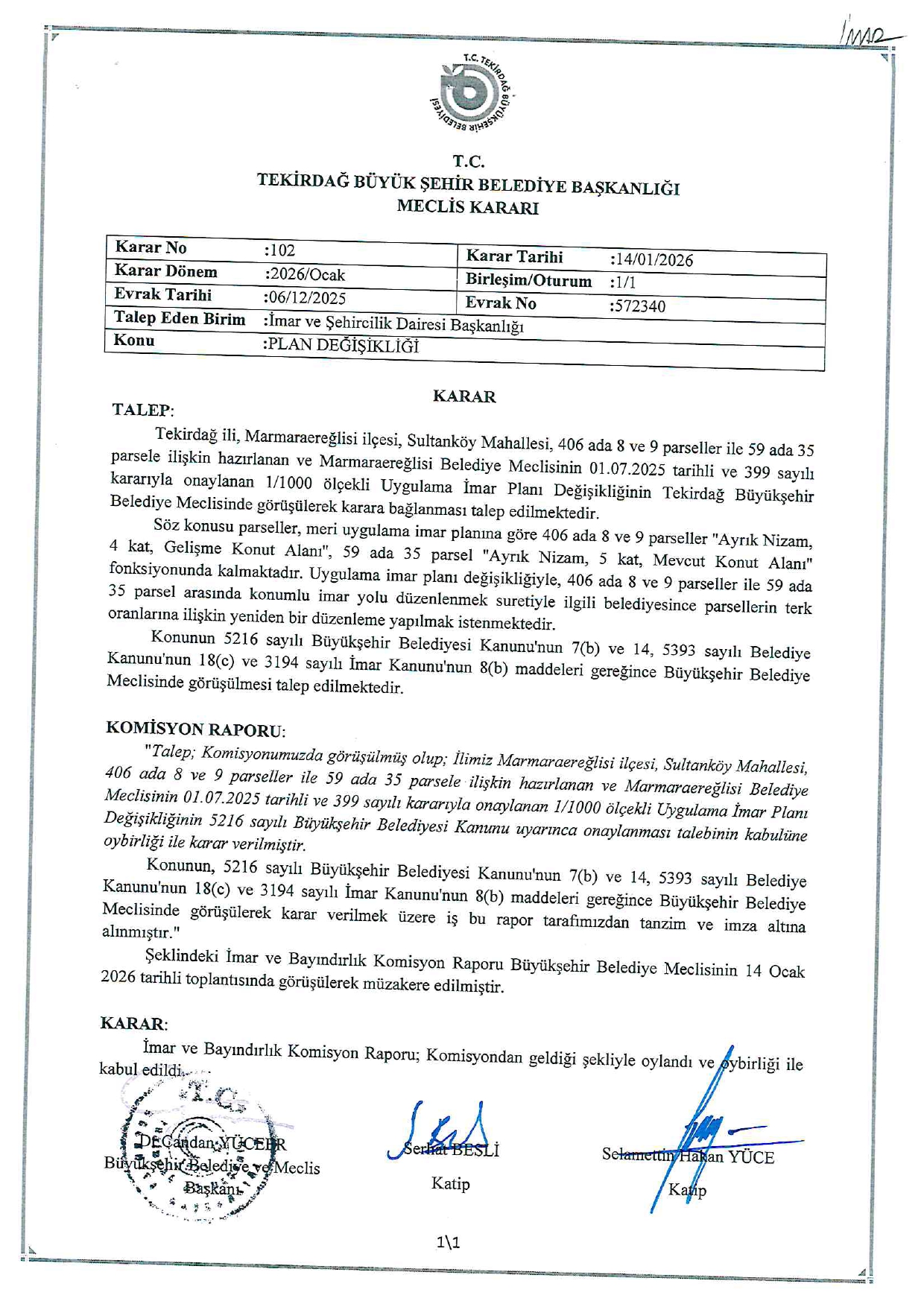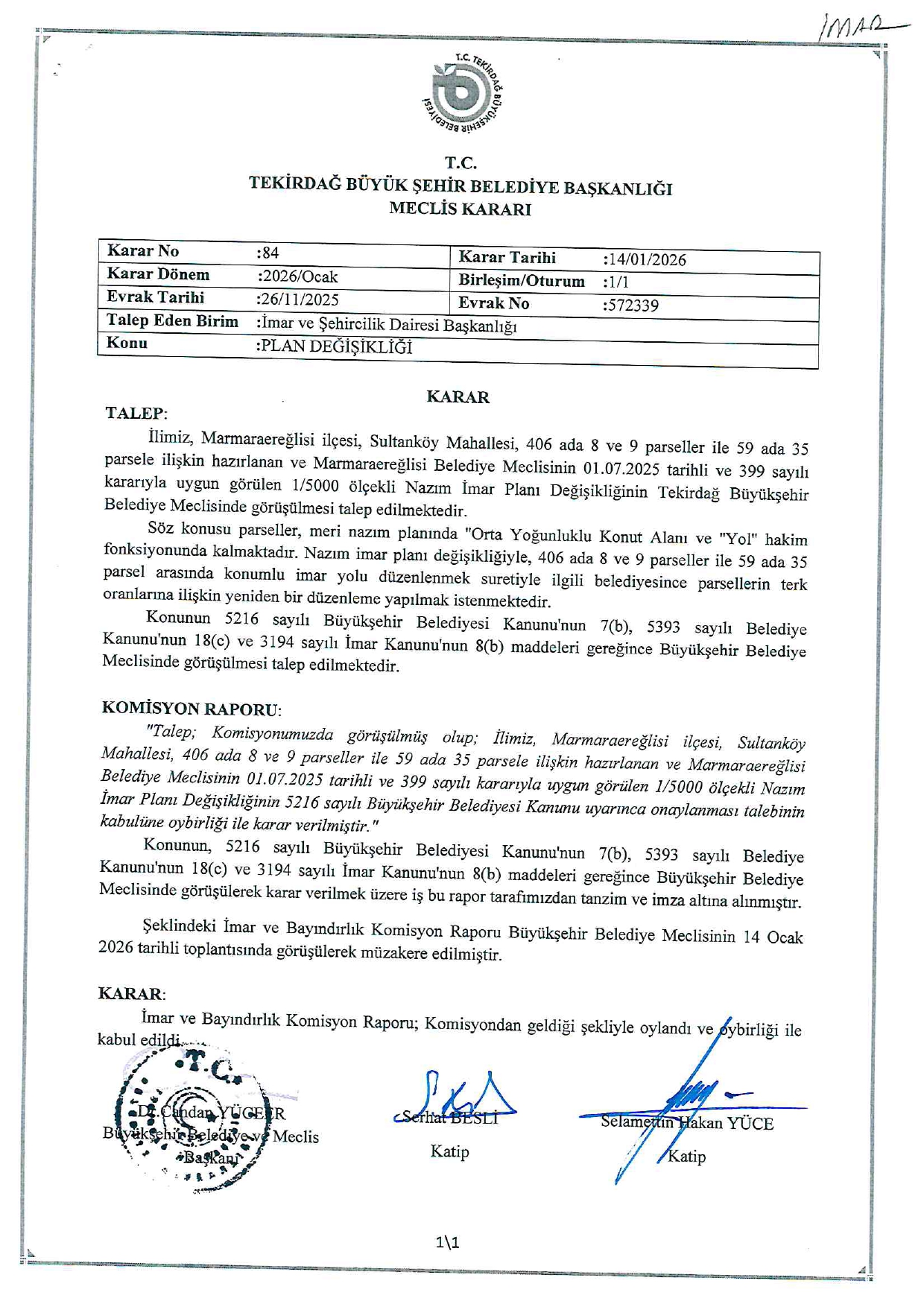 2026 YILI OCAK AYI OLAĞAN MECLİS KARARLARI