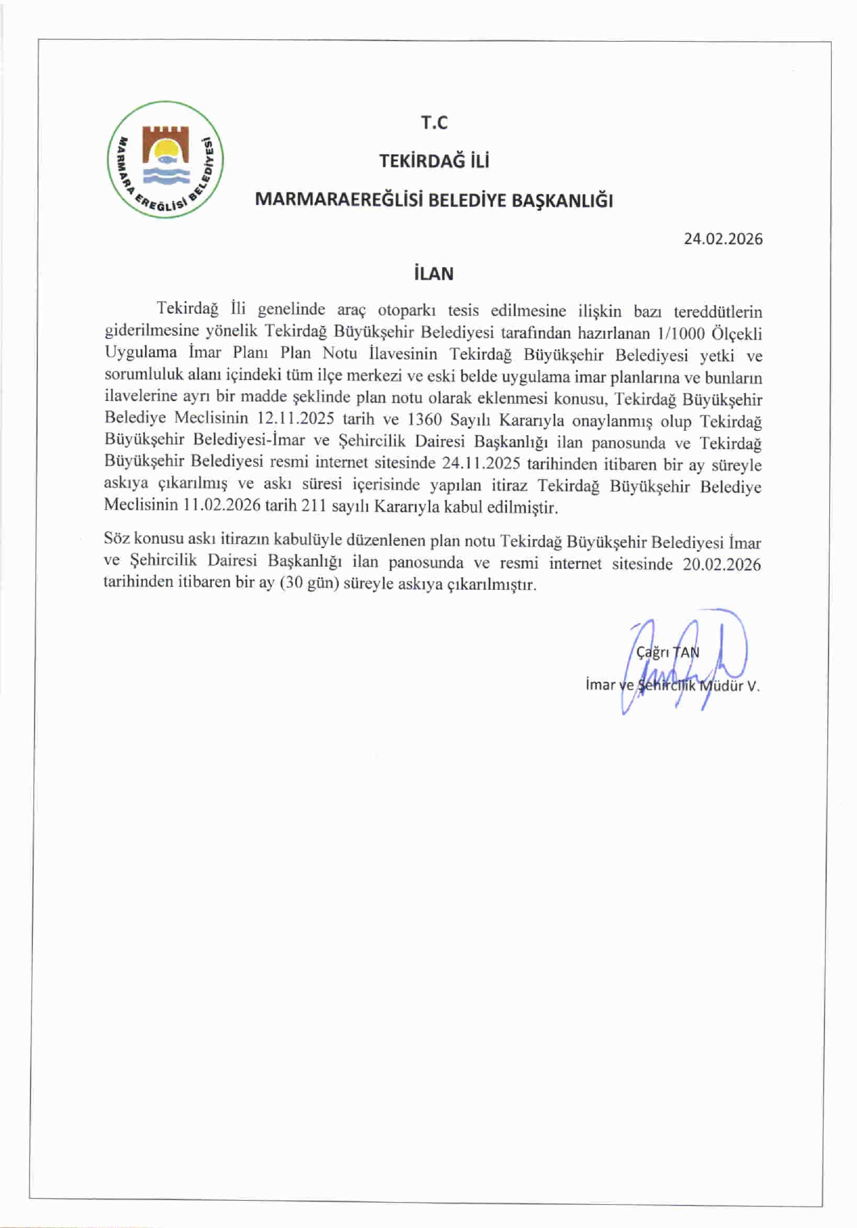 Askı İtirazı Düzenlemesi Duyurusu (ön Bahçe Otopark Alanı)